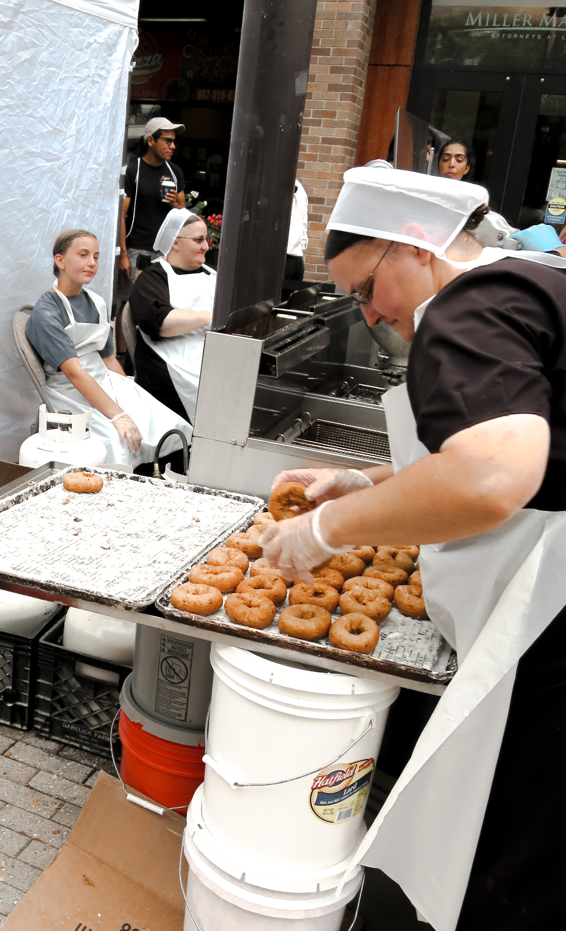 Across the walkway, I could see the Amish hard at work. An older woman in a black dress and white bonnet wearing thin-rimmed glasses manned the cashbox. A younger boy with a mess of curly hair near the back of the tent sat observing the crowd while a tray of doughnuts lay in front of him ready to be glazed. Whirring sounds from the mixing of batter floated through the air as two younger girls stood in front of a messy, large metal bowl.